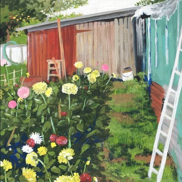A bright summer’s day at the allotments — sunlight spilling over weathered sheds, prize-winning dahlias in full bloom, and the quiet rhythm of tending, mending, and growing.